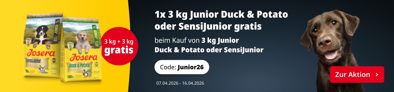 *Gültig im Aktionszeitraum vom 07.04.2026 bis einschließlich 16.04.2026 und nur beim Kauf von 1x Junior Duck & Potato 3 kg oder 1x SensiJunior 3 kg. Die Teilnahme an der Aktion ist nur einmal pro Person und Bestellung möglich und gilt nur im Josera Onlineshop. Nur solange der Vorrat reicht. Nicht mit anderen Aktionen kombinierbar.