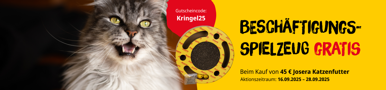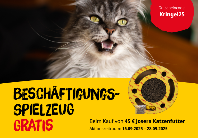 Bestelle vom 16.09.–28.09.Katzenfutter von Josera, JosiCat und Josera Help für mindestens 45 €, gib den Code „Kringel25“ beim Checkout an – und wir packen das Beschäftigungsspielzeug gratis dazu!