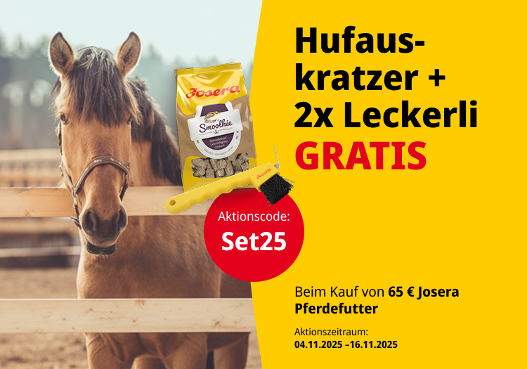 So bist Du dabei: Du packst vom 04.11. bis 16.11. Pferdefutter von mindestens 65 € im Josera Onlineshop in den Warenkorb, gibst den Code „Snack25“ an – und wir packen einen Hufauskratzer und 2x Leckerli gratis dazu.
