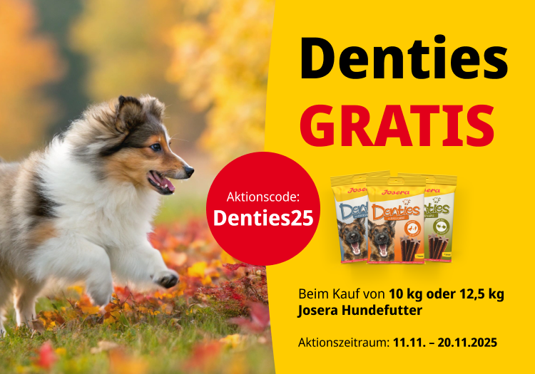 Und so geht’s: Du packst vom 11.11. bis 20.11. Hundefutter im Großgebinde in den Josera Warenkorb, gibst beim Check-out den Code „Denties25“ an – und wir legen eine Packung Denties Kausnacks gratis mit dazu!