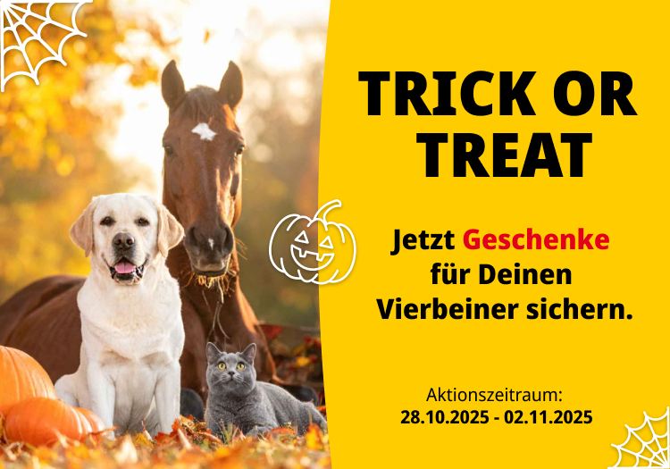 Vom 28.10. bis 02.11. wird es schaurig lecker – oder verspielt. Denn wenn Du für mindestens 65 € Hundefutter oder für mindestens 45 € Katzenfutter oder für mindestens 60 € Pferdefutter bei uns im Onlineshop einkaufst, schenken wir Dir was! So wird die Gruselgarantie zur Gratisgarantie.