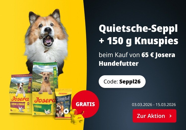 Bestelle vom 03.03. bis 15.03.2026 mindestens 65 € Hundefutter (inkl. Help) im Josera Onlineshop und sichere Dir den einzig wahren, den originalen, unseren allseits bekannten Seppl! Oh, und 150 g Knuspies gibt’s außerdem gratis dazu!