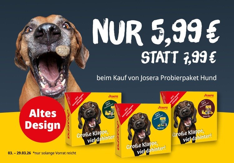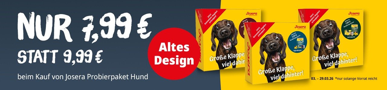 Altes Design, altbekannte Qualität! Jetzt wird’s spannend für alle Probierfreudigen: Unsere Probierpakete im alten Produktdesign sind vom 03.03.2026 bis 29.03.2026 für nur 7,99 € statt 9,99 € im Sale erhältlich! Perfekt, um neue Sorten für Deinen Hund zu entdecken.