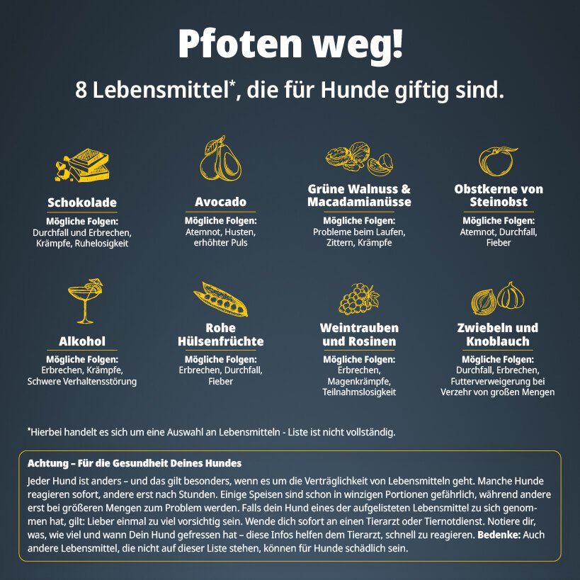 Bevor Du Deine Leckereien mit dem geliebten Vierbeiner teilst, informiere Dich bitte, ob es für Deinen Hund auch gesund ist. Eine Übersicht giftiger Lebensmittel für Hunde findest Du hier.