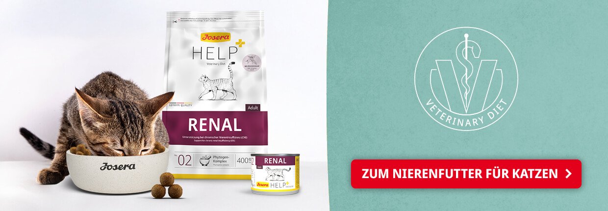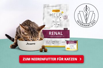Neben Medikamenten muss Dein vierbeiniger Mitbewohner eine spezielle Nierendiät bekommen. Dafür eignen sich spezielle Alleinfuttermittel wie Josera Help Renal, das mit seiner Rezeptur aus hochwertigen Zutaten auf die Bedürfnisse einer nierenkranken Katze abgestimmt ist.