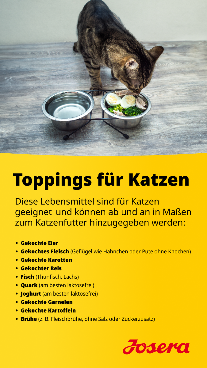 Du kannst wie oben beschrieben einfach Toppings oder für Katzen geeignete Soße über das Josera Trockenfutter geben. Das bringt nicht nur mehr Geschmack, sondern sorgt auch für mehr Abwechslung im Napf – das mögen viele Katzen besonders gern.