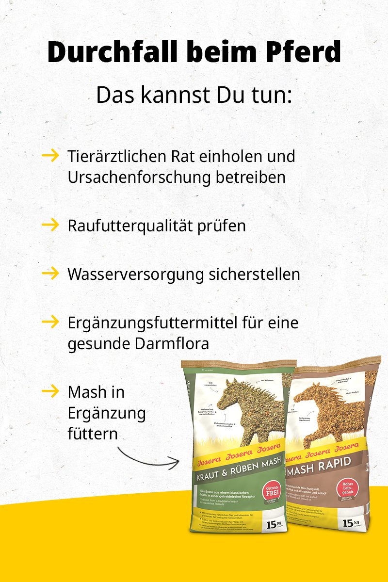 Zur Regeneration nach einer überstandenen Erkrankung hat sich Mash bei Durchfall als wertvoll erwiesen: Aufgrund seiner leicht verdaulichen Komponenten belastet Mash den Verdauungstrakt des Pferdes nicht und versorgt es mit wichtigen Nährstoffen.