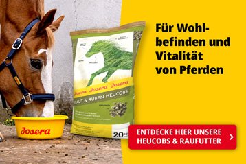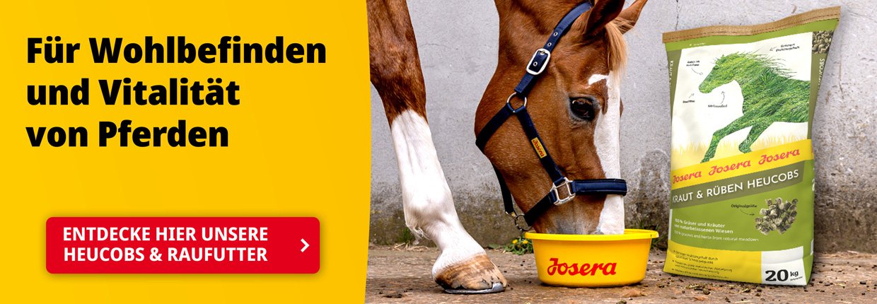Hochwertige Heucobs können im Bedarfsfall als kompletter Heuersatz sinnvoll sein oder die Grundfutterration ergänzen. In erster Linie sollte immer darauf gedachtet werden, dass hochwertiges Raufutter zur Verfügung steht. Sollte das zur Verfügung stehende Heu qualitativ minderwertig sein, sollte dies unbedingt geändert werden. Bei alten Pferden, Zahnproblemen beim Pferd oder Atemwegsbeschwerden des Pferdes können z. B. Josera Kraut & Rüben Heucobs eine gute Alternative sein, um den Bedarf des Pferdes an wichtiger Rohfaser zu decken und dem natürlichen Fressverhalten entgegenzukommen. Sie eignen sich auch gut als Kraftfutterersatz in Kombination mit einem hochwertigen Mineralfutter. Heucobs sollten immer eingeweicht gefüttert werden. Dabei kann sowohl warmes als auch kaltes Wasser verwendet werden, wobei warmes Wasser die Quellzeit verkürzt. Weitere Fragen zum Thema Heucobs füttern geben Dir gerne unsere Fütterungsexperten. Natürlich stehen diese Dir auch bei allen anderen Fragestellungen rund um das richtige Futter für Dein Pferd zur Seite.