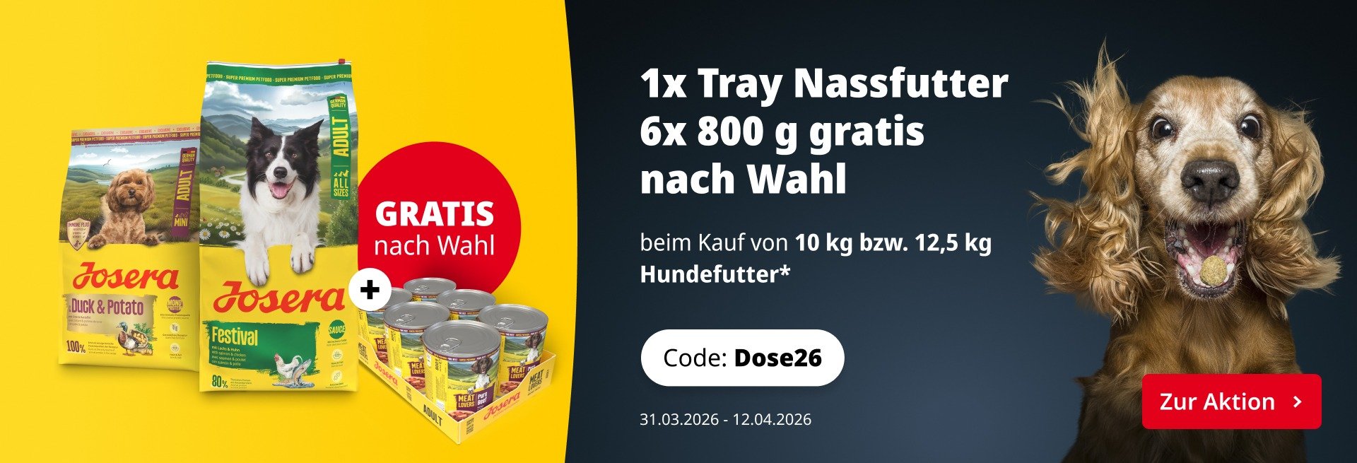 *Gültig im Aktionszeitraum vom 31.03.2026 bis einschließlich 12.04.2026. Beim Kauf eines Großgebindes (10 kg oder 12,5 kg) erhältst Du 1 Gratis-Tray Meat Lovers Nassfutter (6 x 800 g). Pro Bestellung kann maximal 1 Gratis-Tray pro Aktionscode eingelöst werden, auch wenn mehrere Großgebinde im Warenkorb liegen. Ausgenommen sind Katzen- und Pferdefutter. Der Rabatt gilt nur für die angegebene Aktionsware und kann nicht mit anderen Aktionen kombiniert werden.