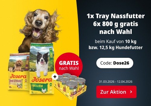 Und so geht's: Du bist Mitglied im Josera VIP Club? Dann packe ein Trockenfutter Deiner Wahl im 10 kg oder 12,5 kg Sack in den Warenkorb, suche Dir Dein Lieblings-Nassfutter-Tray aus dem Meat Lovers Sortiment aus (6 x 800 g) und gibt den Code „Dose26“ ein. Schon kommen sechs Dosen 800 g Nassfutter gratis mit!
