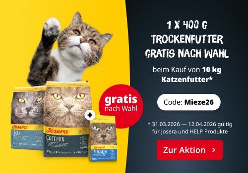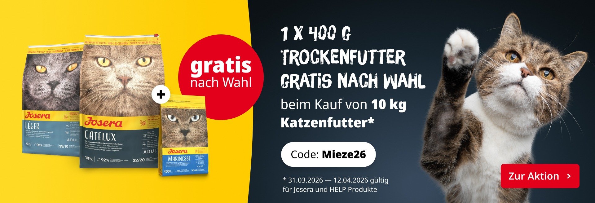 *Gültig im Aktionszeitraum vom 31.03.2026 bis einschließlich 12.04.2026. Beim Kauf eines Großgebindes (10 kg) erhältst Du 1 Gratis 400 g Beutel Josera Katzenfutter. Pro Bestellung kann maximal 1 400 g Beutel pro Aktionscode eingelöst werden, auch wenn mehrere Großgebinde im Warenkorb liegen. Ausgenommen sind Hunde- und Pferdefutter. Der Rabatt gilt nur für die angegebene Aktionsware und kann nicht mit anderen Aktionen kombiniert werden.